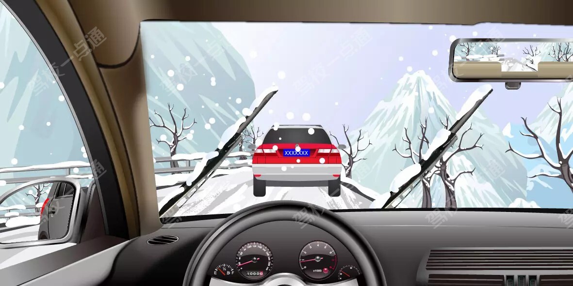 本题考点为灯光的使用相关内容图中是雪天能见度低,且前方有车,跟车行驶要使用近光灯不止夜间需要开灯,能见度低的情况下也要开灯《道路交通安全法实施条例》规定:机动车在夜间没有路灯、照明不良或者遇有雾、雨、雪、沙尘、冰雹等低能见度情况下行驶时,应当开启前照灯、示廓灯和后位灯,但同方向行驶的后车与前车近距离行驶时,不得使用远光灯