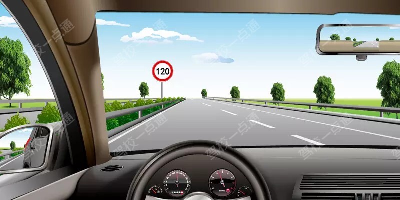 图中左侧红圈白底标志是限速标志,图中数字是120,表示最高车速为120公里/小时红圈白底限制最高速度,蓝底限制最低速度