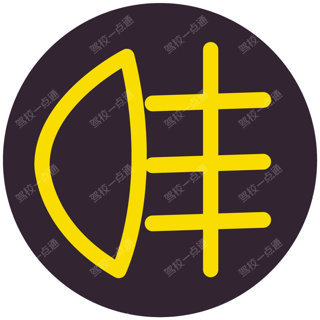 本题考点为辨认前后雾灯图中仪表板上的灯,有纵向线且黄色光线向右,是后雾灯前雾灯绿色朝左,后雾灯黄色朝右
