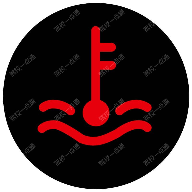 本题考点为指示灯图中有红色温度计,表示是水温指示灯,车辆启动后一直亮起,说明发动机温度过高,可能是冷却液不足,需要停车检查