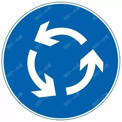 图中标志为圆形蓝色底,图案为三个首尾连接呈环形的白色箭头,是指示标志中的环岛行驶标志,表示只准一切车辆靠左侧道路行驶。此标志设在环岛面向路口来车方向适当位置。