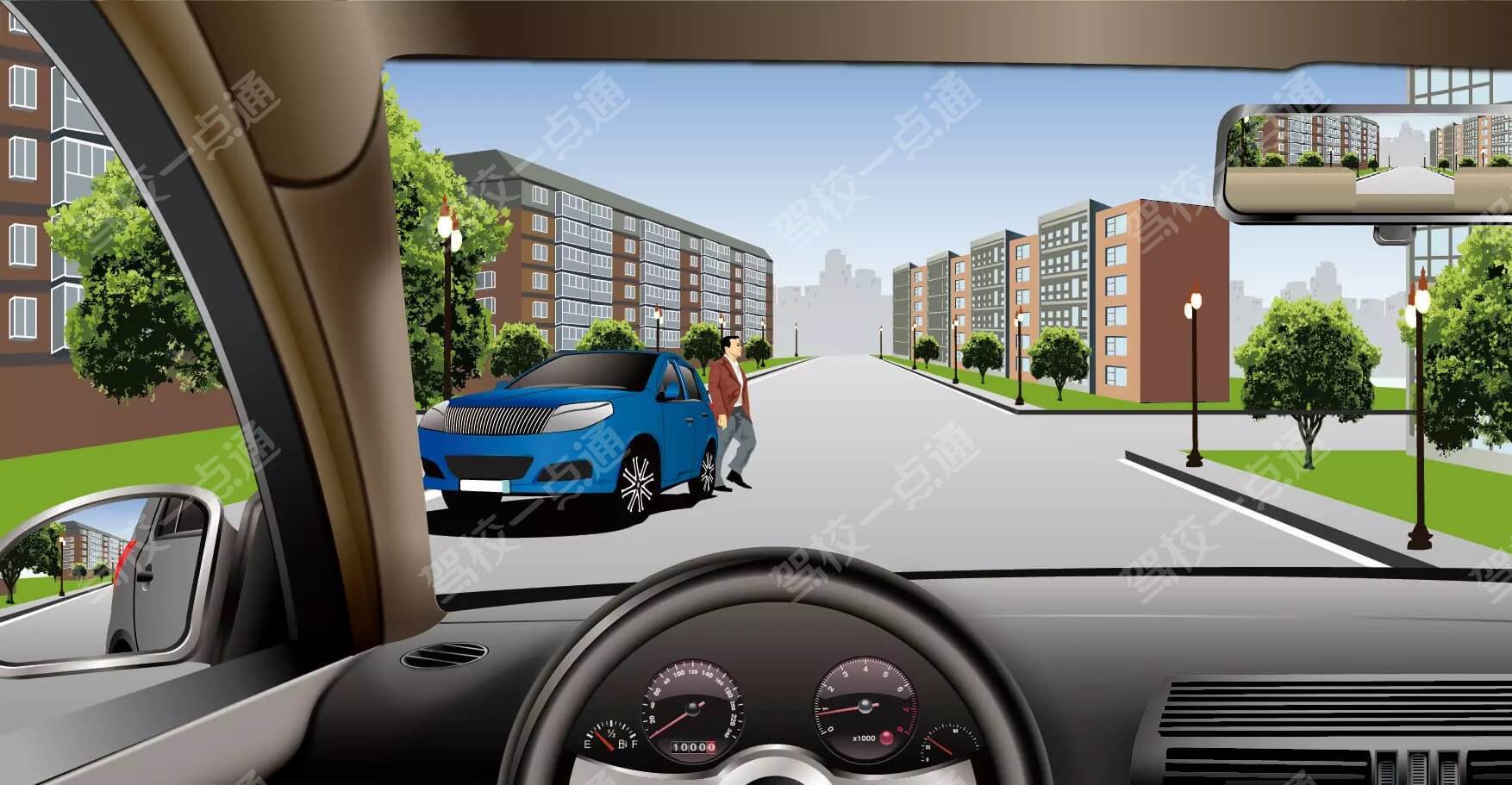 图中是居民区,左侧有行人正在横过道路,应减速,准备停车居民小区内人员活动较为频繁,道路情况复杂当看到有人横穿道路时,减速并准备停车能够最大程度保障行人的安全,避免发生碰撞事故