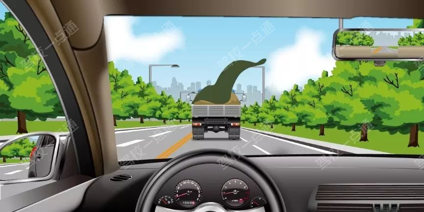 图中道路中心线为双黄实线,不可变道超车。驾驶机动车遇到前方货车篷布未遮盖好的情况,跟车要保持较大安全距离,防止篷布脱落遮挡行车视线,造成安全隐患。
